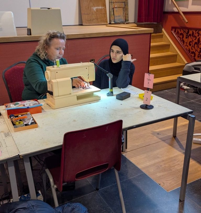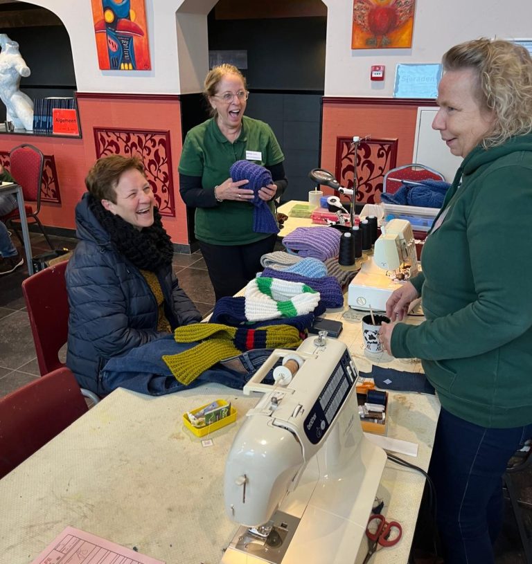 Niet alleen de technische vrijwilligers hadden de handen vol, ook bij de kledinghoek was het een drukte van jewelste. Naast het gebruikelijke naaiwerk kwam er een ware uitdaging op tafel: een kinderwagen waarvan de stof gerepareerd moest worden.